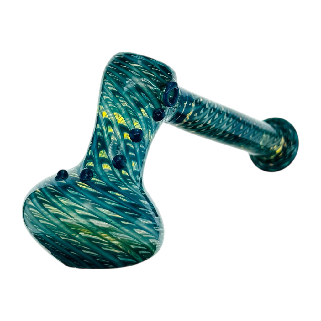 This 6-inch long hammer bubbler features distinctive blue wrap and rake accents layered over color-shifting fumed borosilicate glass. The precision-engineered structure delivers an open, unobstructed airflow suitable for both dry and water-filtered use, accommodating different consumption preferences. Engineered for portability without sacrificing durability or visual appeal.