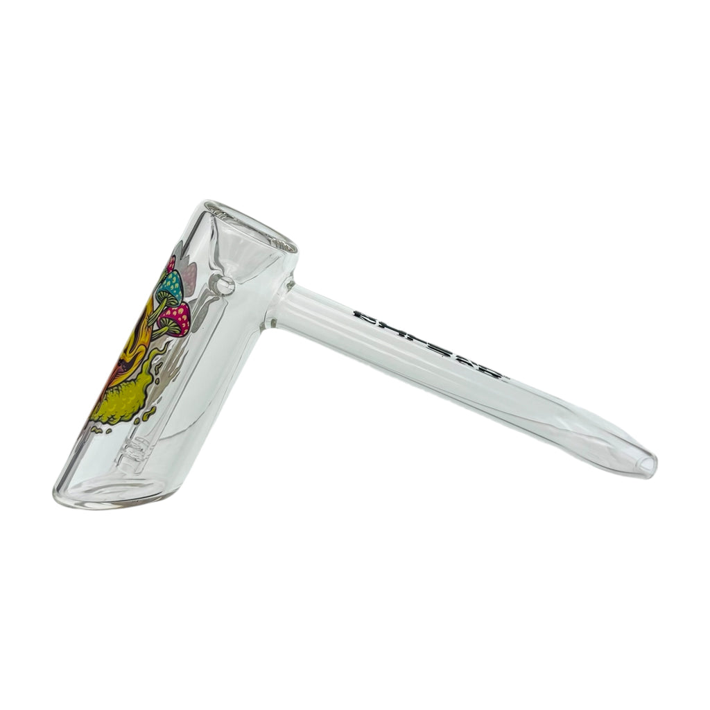 This compact glass bubbler showcases artistic imagery of a melting smiley face with mushrooms sprouting from the face. Standing 7 inches in length with a 4-inch tall chamber, it delivers efficient water filtration in a portable format. Crafted from premium borosilicate glass, this piece combines durability with distinctive visual appeal for the discerning collector.