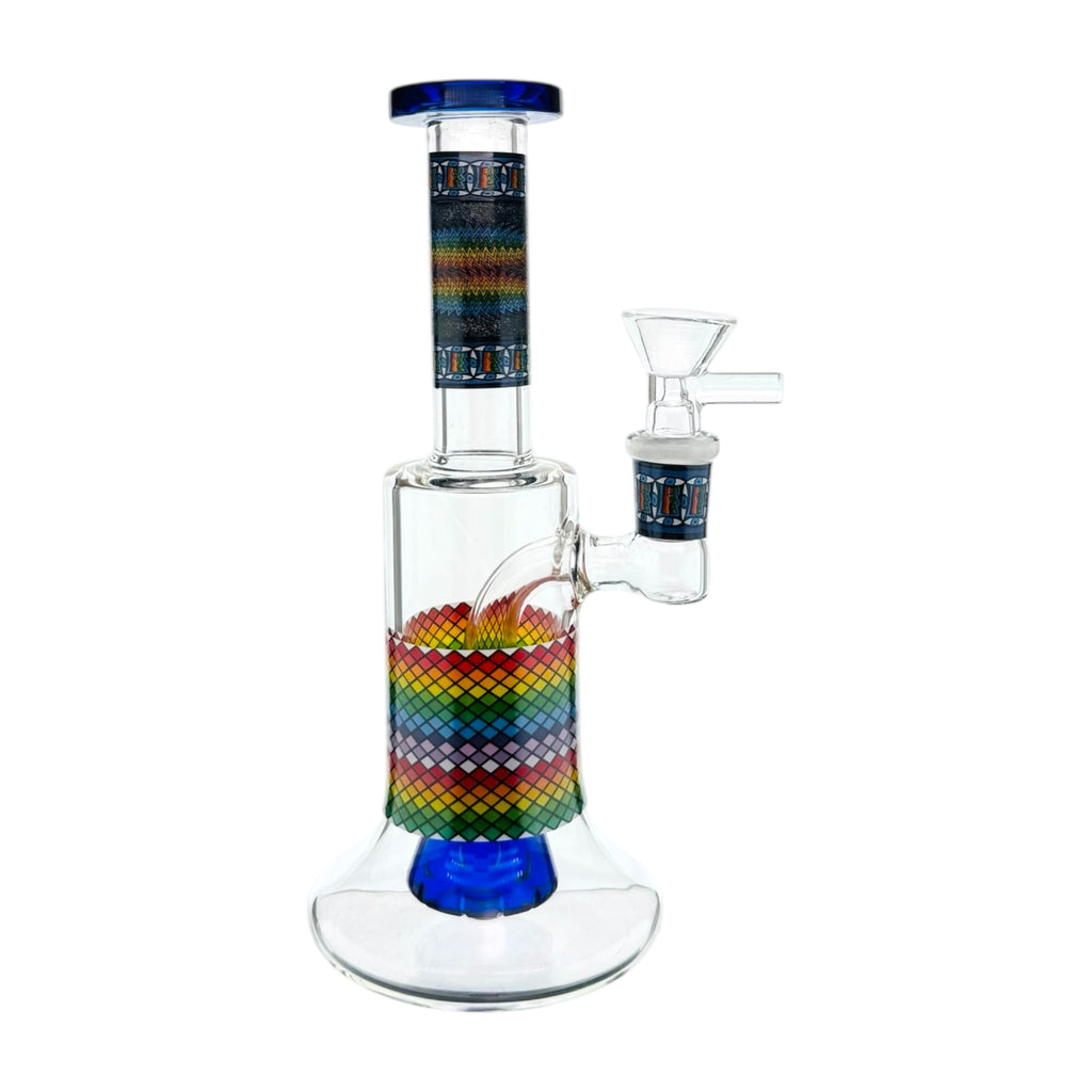 Standing at a handy 7.5 inches, this pint-sized glass bong packs serious performance into a portable package. The fixed 14mm female joint keeps things simple and reliable, while the multi-slit blue water percolator delivers buttery-smooth hits every time. Top it off with that eye-catching rainbow reversal flip decal.