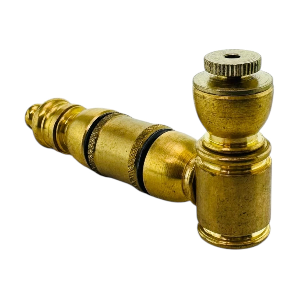 Compact yet mighty, this brass hand pipe packs serious performance into a pocket-friendly 2.5-inch frame. Built for the smoker who refuses to sacrifice quality for convenience, it features premium brass construction that's built to last. The clever modular setup breaks down completely for hassle-free cleaning, while the included metal cap doubles as both a protective shield and an airflow control tool. Recommended screen size 0.5" width.
